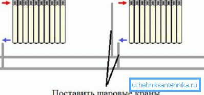 Dvopolna možnost montaže zagotavlja vzporedno povezavo baterij. V tem primeru se distribucija izvede hkrati vsem radiatorjem, druga cev pa povratna cev. Bypass v takem sistemu ni nameščen, ker odstranitev ene od celic ne ustavi celotnega sistema. Toda, kot v prvem primeru, je treba pri vhodu in izstopu pritrditi krogelne ventile.