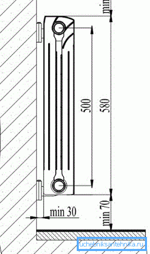 - Pri izbiri radiatorja za velikost ne pozabite, da je najmanjša razdalja od baterije do tal 70 mm, reža od zgornjega konca do okenske police je 80 mm, razdalja od stene pa mora biti najmanj 30 mm.